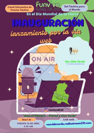 🌎☘️🎤💥📚🖍️🎧 Funvive Táchira tiene el gusto de invitarle a la inauguración de nuestra Emisora Radial Web Online VOZ VIDA VERDE "Tu Onda Ambiental", que se efectuará el Sábado 22 de Abril, en el marco de la celebración del "Día Mundial de la Tierra". Esperamos...